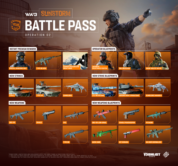 Боевой пропуск операции «Солнечный шторм» уже можно приобрести в игре. Приобретите его для доступа к премиальным уровням с эксклюзивными косметическими чертежами оружия, усилений и экипировок. При покупке вы сразу же получите фон "Большая волна", чертеж оружия Type-89 Ashi и чертеж экипировки "Специальный абордажный отряд".